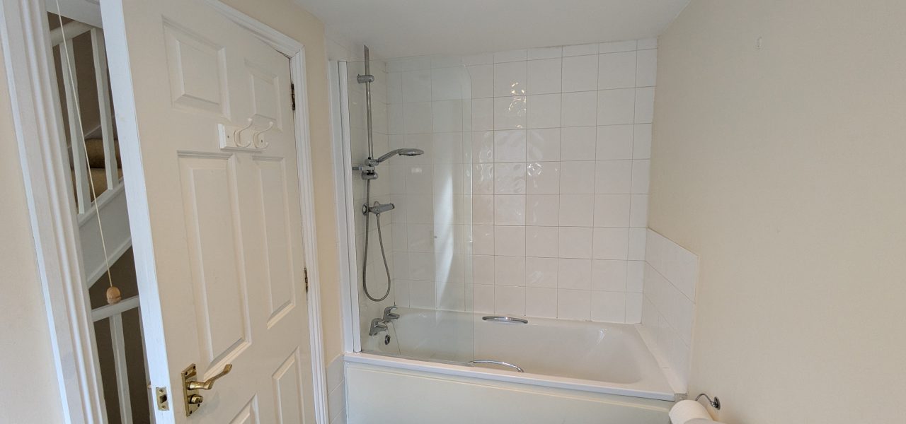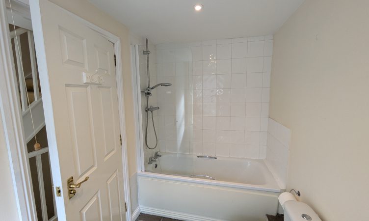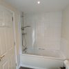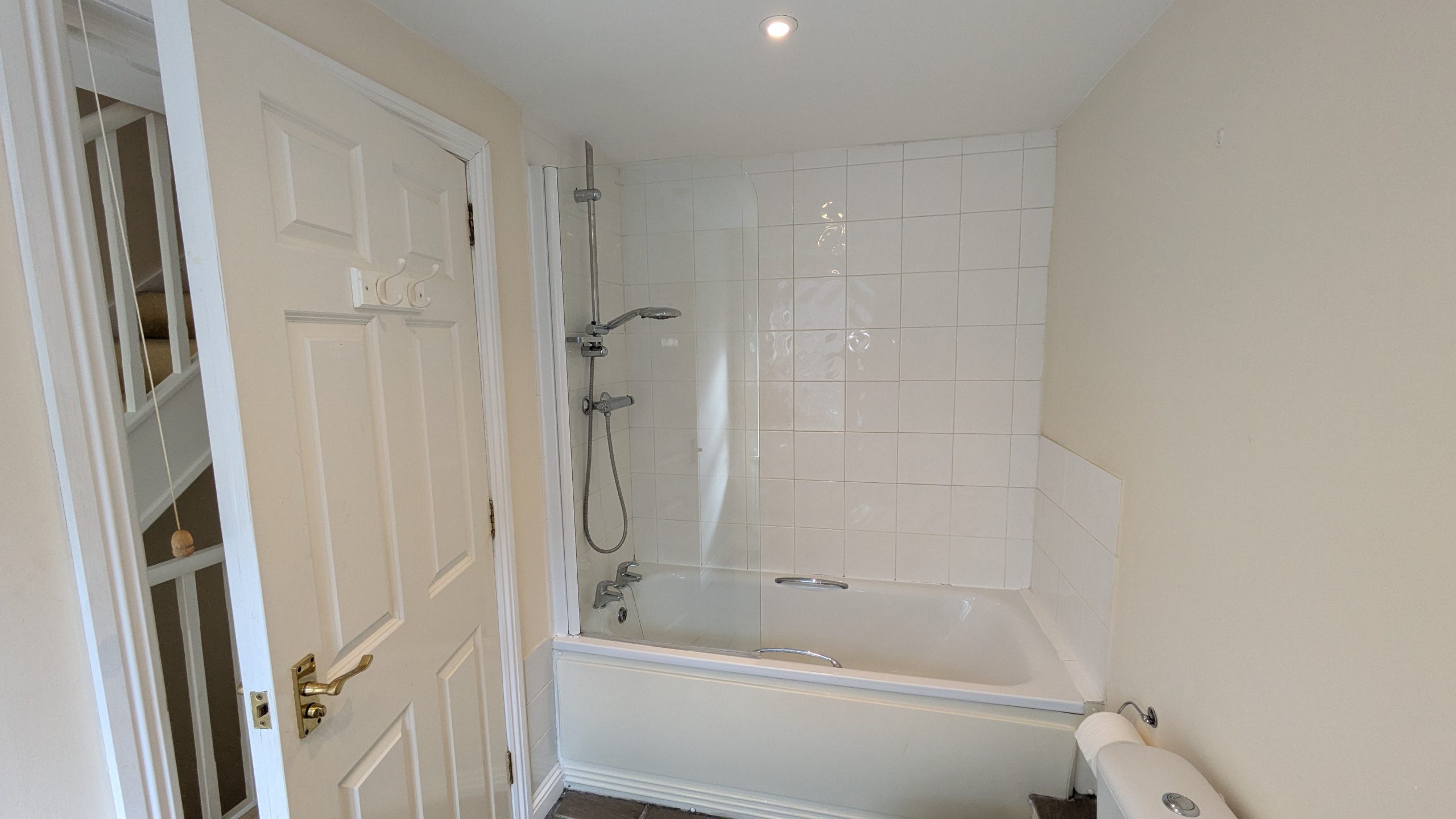 White suite comprising panelled bath with shower unit over and shower screen door, WC and wash hand basin. Tiled floor, light/shaver point, inset ceiling lights, extractor fan, window.