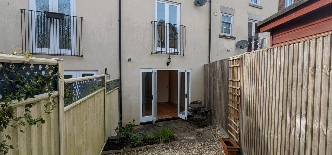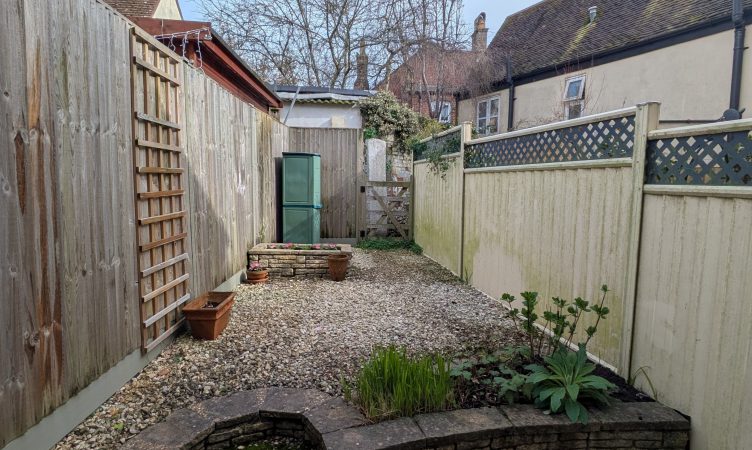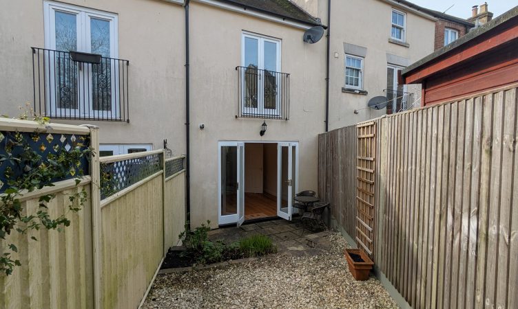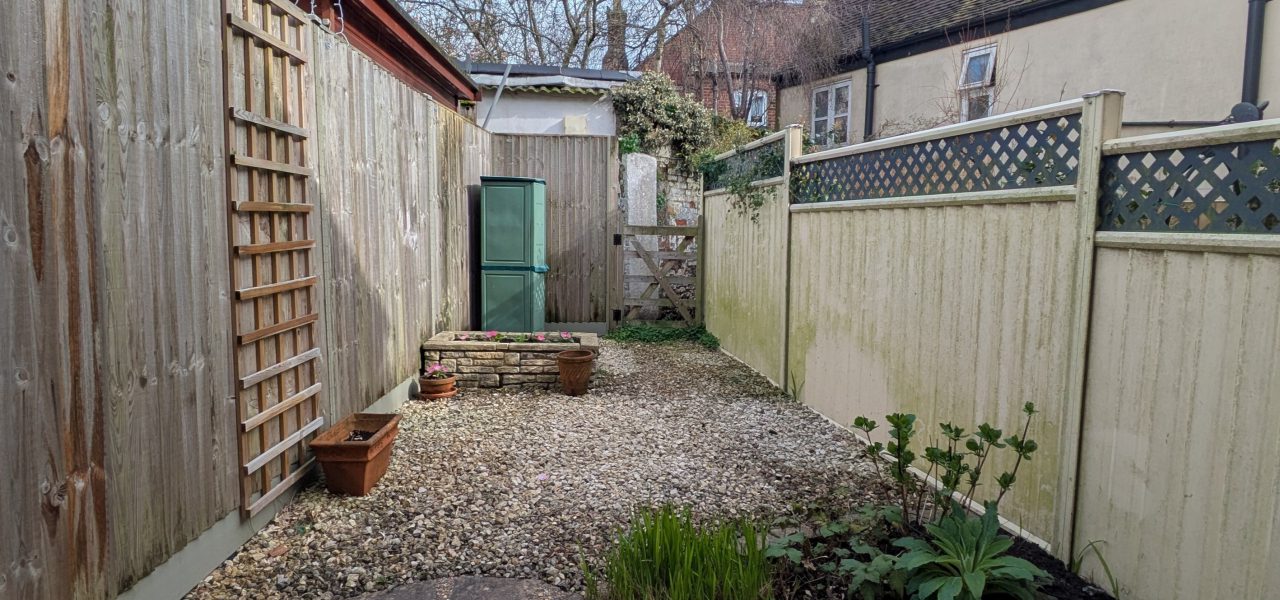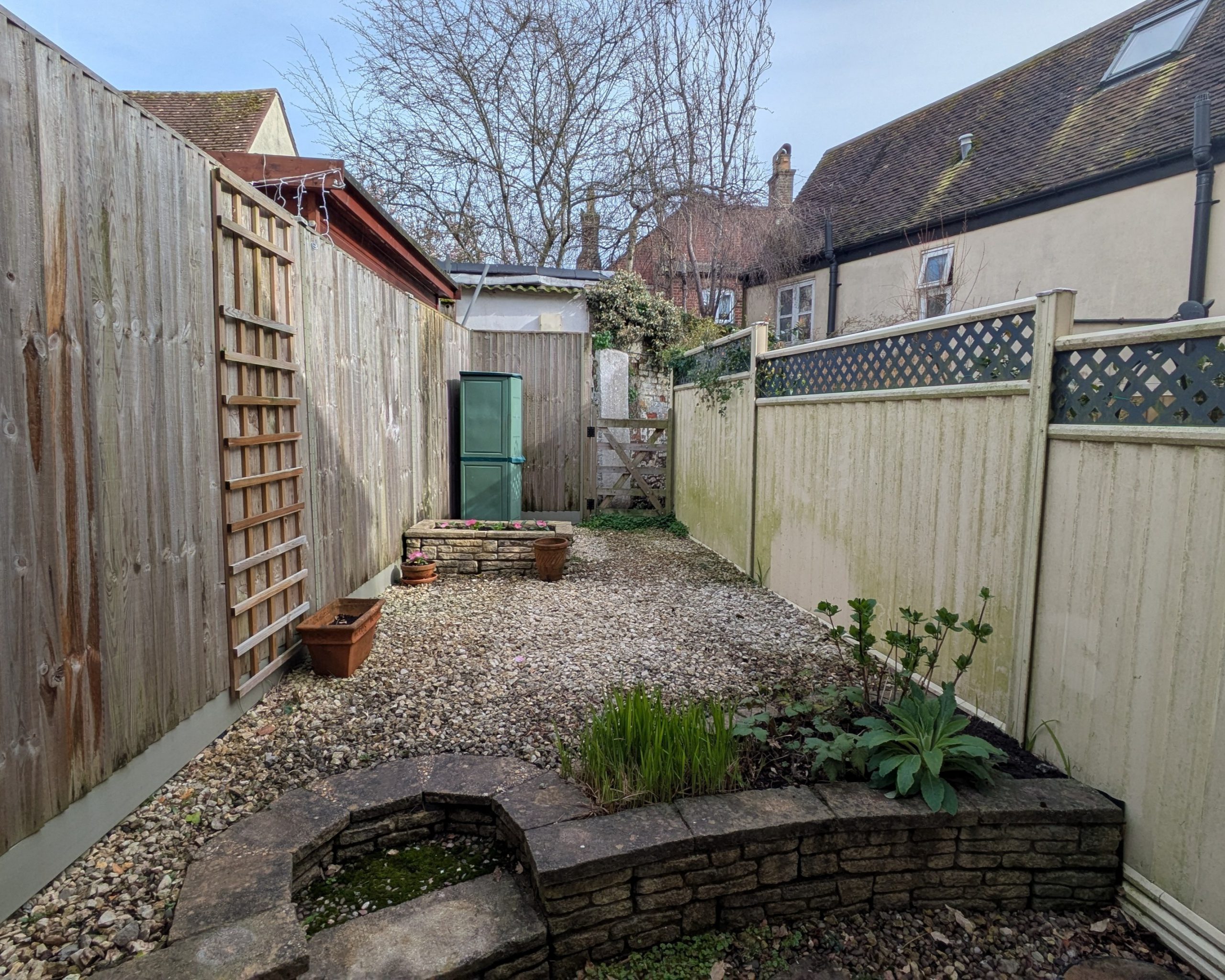 Low maintenance Rear Garden with paved patio, raised beds and gravelled areas. Gate to private footpath leading back to Whitecliff Mill Street.