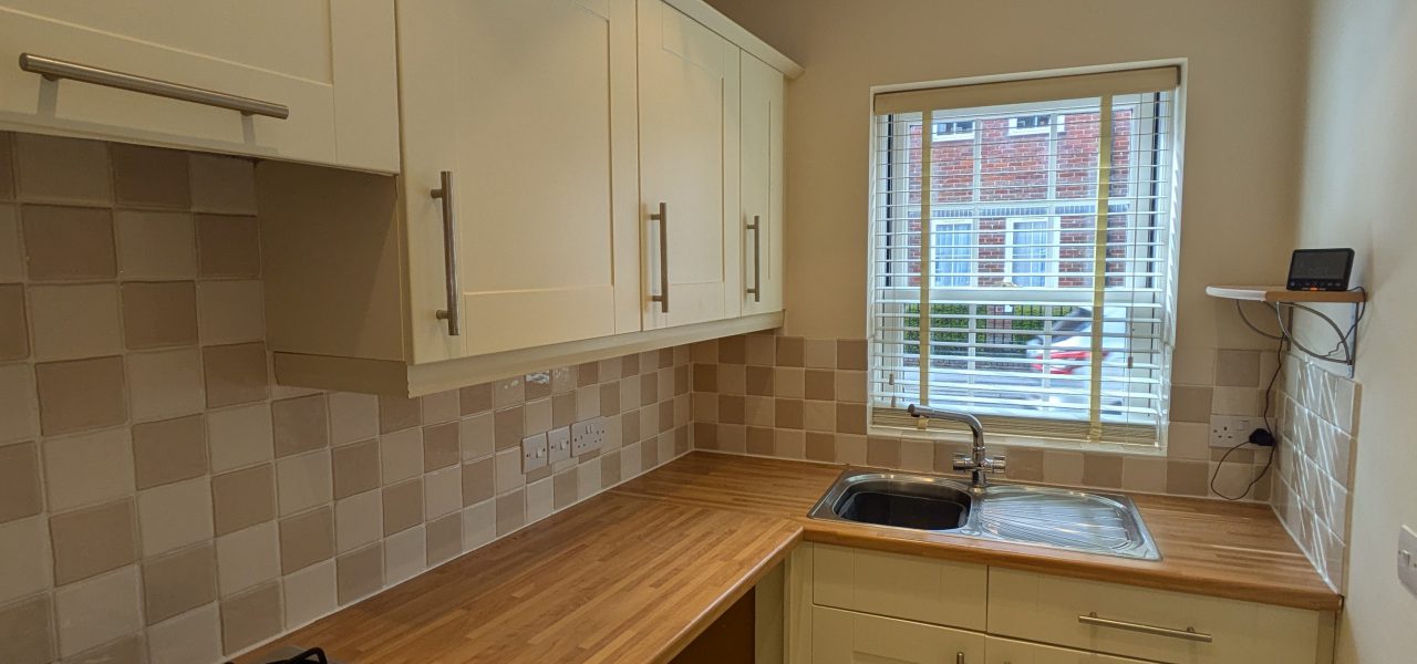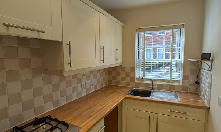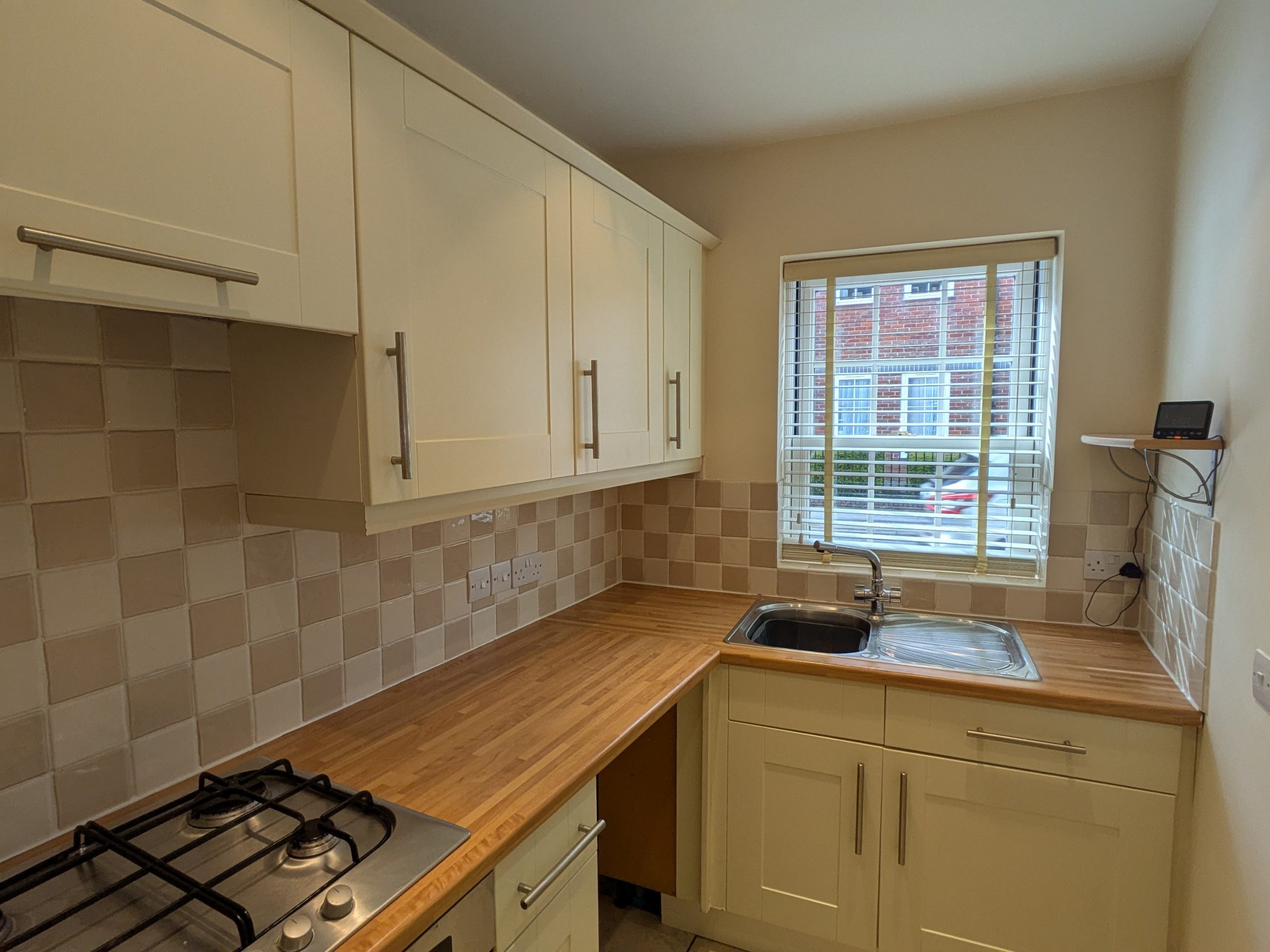 Fitted with a range of wall and floor units, worktops with tiled splashbacks, inset sink with mixer tap, built-in gas hob, oven and extractor hood, space for washing machine and fridge/freezer, inset ceiling lights, tiled floor.